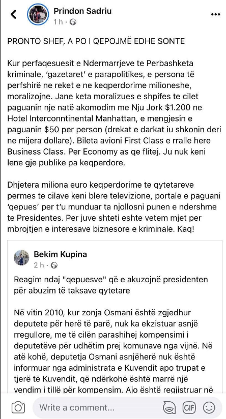 “Kur përfaqësuesit e Ndërmarrjeve të Përbashkëta kriminale, ‘gazetarët’ e parapolitikës, e persona të përfshirë në reket e në keqpërdorime milionëshe, moralizojnë. Janë këta moralizues e shpifës të cilët paguanin një natë akomodim me Nju Jork $1.200 në Hotel Interconntinental Manhattan, e mëngjesin e paguanin $50 për person (drekat e darkat iu shkonin deri ne mijëra dollarë)”, ka shkruar Sadriu, të martën vonë.