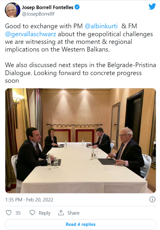 “Shkëmbime të mira me kryeministrin Albin Kurti dhe ministren e Jashtme, Donika Gërvalla në lidhje me sfidat gjeopolitike që po shohim për momentin dhe implikimet rajonale në Ballkanin Perëndimor. Ne diskutuam gjithashtu edhe hapat e ardhshëm në dialogun Beograd-Prishtinë. Mezi presim së shpejti të kemi përparim konkret”, ka shkruar Borrell.
