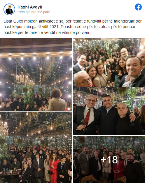“Lista Guxo mbledh aktivistët e saj për festat e fundvitit për të falenderuar për bashkëpunimin gjatë vitit 2021. Poashtu edhe për tu zotuar për të punuar bashkë për të mirën e vendit në vitin që po vjen.”, thuhet në statusin e tij.