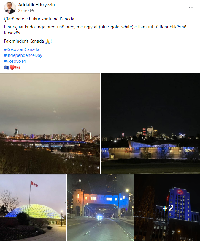 “Çfarë nate e bukur sonte në Kanada. E ndriçuar kudo- nga bregu në breg, me ngjyrat (blue-gold-white) e flamurit të Republikës së Kosovës. Faleminderit Kanada”, ka shkruar Kryeziu.