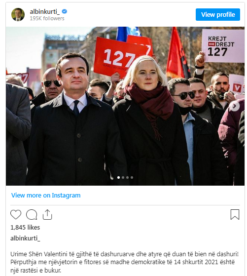 Kryeministri i Kosovës, Albin Kurti, ka uruar të gjithë të dashuruarit për Shën Valentin.
