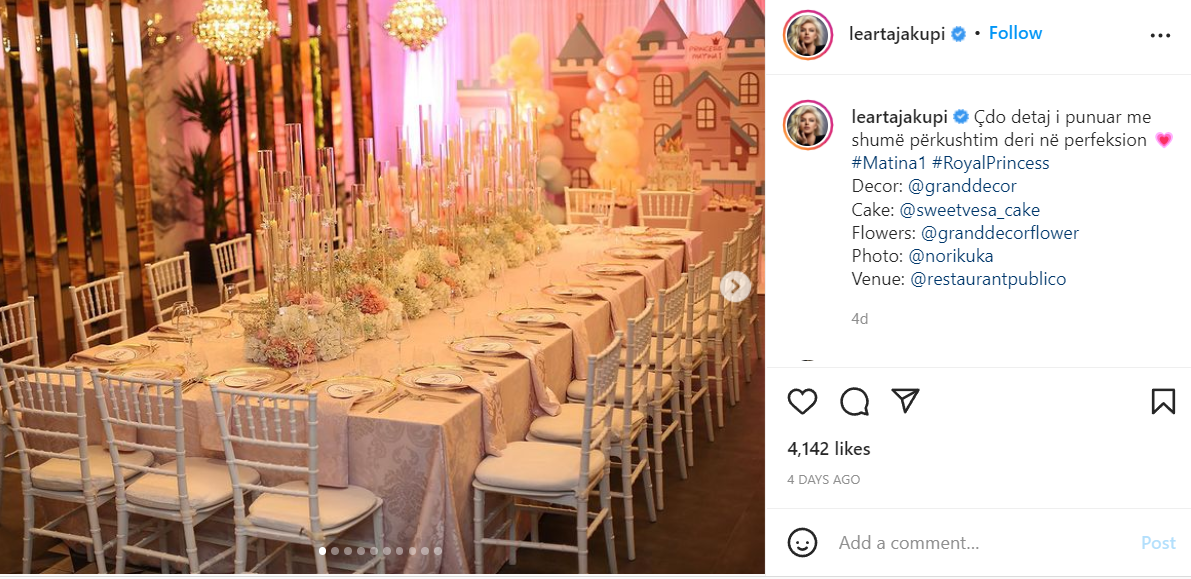 Në Instagramin e Leartës ka gjithsej 58 fotografi nga ditëlindja e vajzës , ku shiheshin po thujase të gjitha detajet e kësaj ditëlindje.