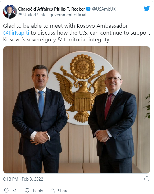 “Më vjen mirë që u takova me ambasadorin e Kosovës, Ilir Kapiti, për të diskutuar se si SHBA-ja mund të vazhdojë të mbështesë sovranitetin dhe integritetin territorial të Kosovës”, ka shkruar Reeker në Twitter.