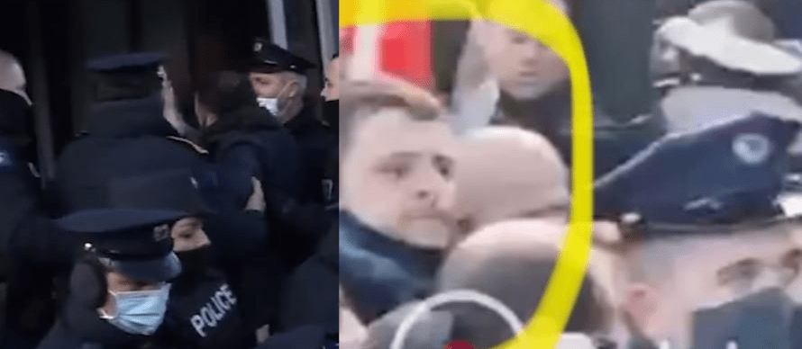 Duke mos e lënë më kaq në hyrje të objektit të Qeverisë së Kosovës, kreu i PSD-së Dardan Molliqaj shihet teksa godet me shuplakë njërin prej policëve të Kosovës.